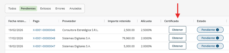 2. Visualizar grilla: verás el detalle de cada retención generada a partir del 01/03/2026.