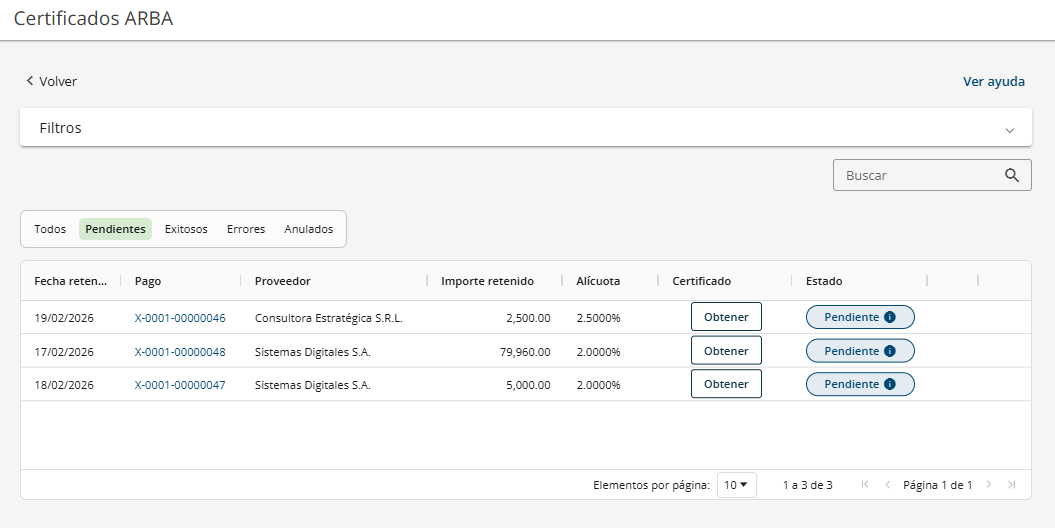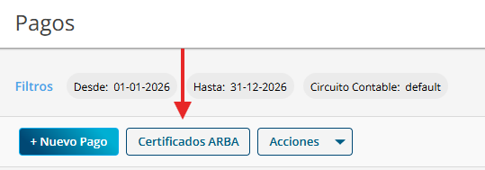 Allí encontrarás el botón “Certificados ARBA” en la parte superior de la pantalla. También podés acceder desde cada pago registrado de forma individual.