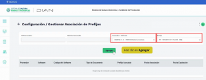 • En el campo “Prefijo”, se listarán las resoluciones de numeración autorizadas por la DIAN bajo la modalidad electrónica. Selecciona el prefijo que deseas asociar a Cadena SA y seguidamente pulsa el botón “Agregar”.