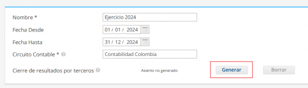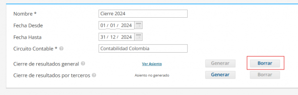 Al eliminar el cierre de resultados general, ya no podrás generar un cierre por cuenta para el período seleccionado. Solo se permitirá generar el cierre de resultados por tercero.